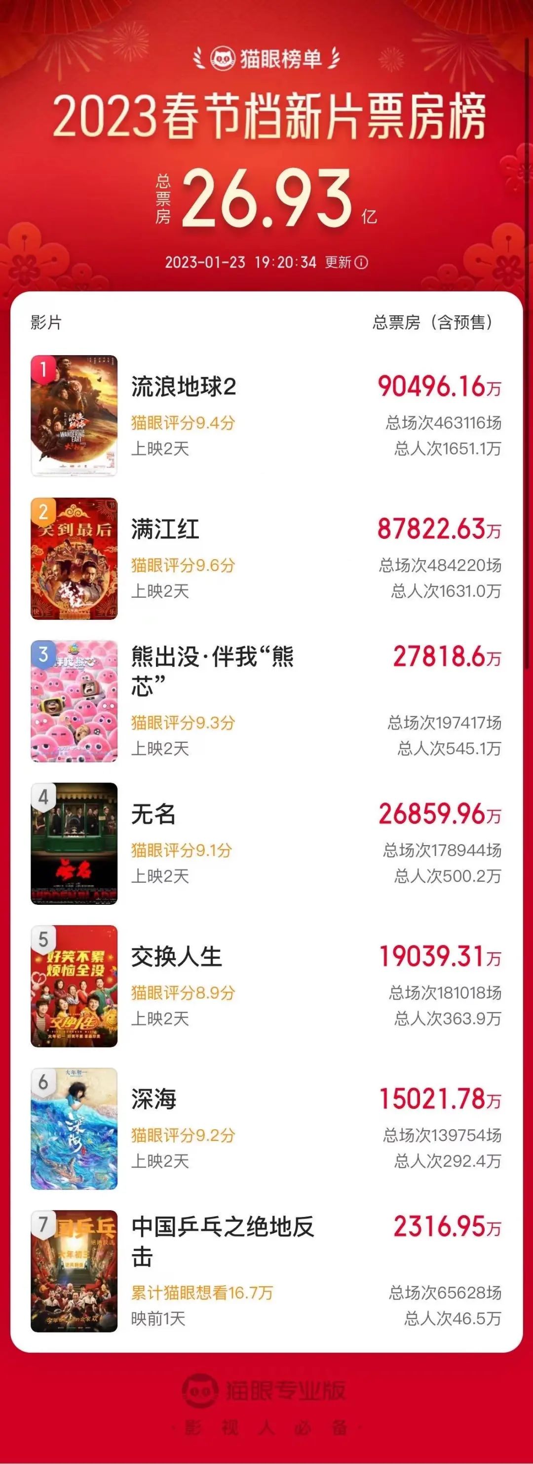 而根据猫眼专业版实时数据,截至发稿,今年春节档新片总票房(含预售)已接近27亿,且目前已上映的6部新片票房全部破亿。