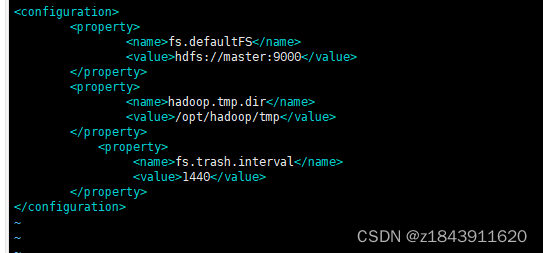 <configuration> <property> <name>fs.defaultFS</name> <value>hdfs://master:9000</value> </property> <property> <name>hadoop.tmp.dir</name> <value>/opt/hadoop/tmp</value> </property> <property> <name>fs.trash.interval</name> <value>1440</value> </property> </configuration> 修改 hdfs-site.xml 将dfs.replication设置为1