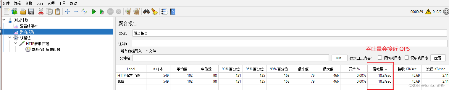 作用:聚合报告:收集性能测试结束后,系统的各项性能指标:如响应时间,并发量,吞吐量,错误率等