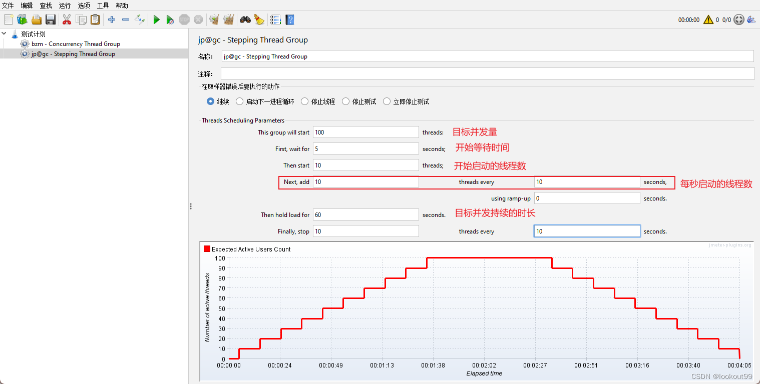 位置:测试计划-->线程组-->Concurrency Thread Group