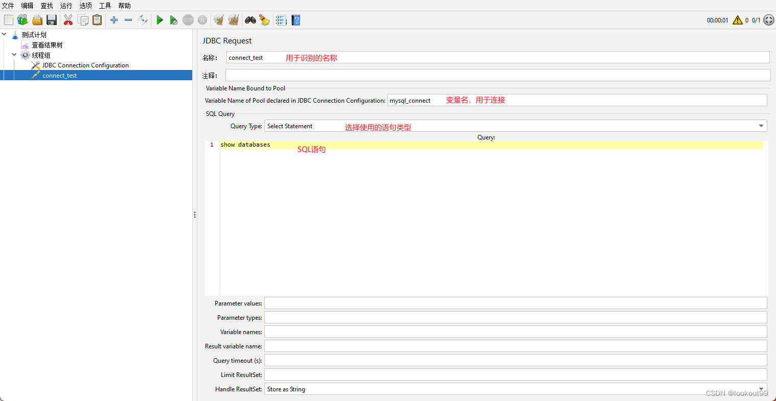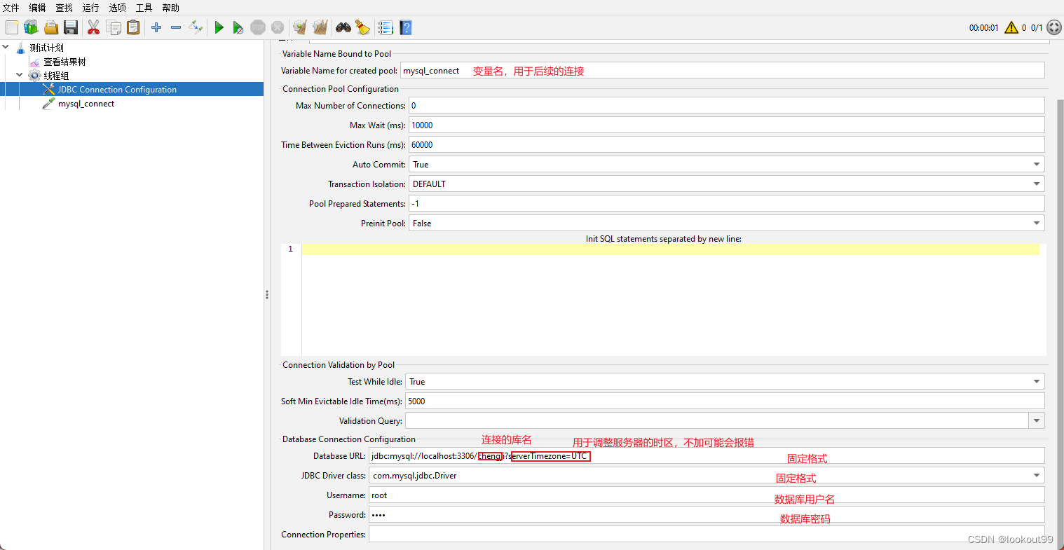 位置:测试计划-->线程组-->配置元件-->JDBC Connection Configuration