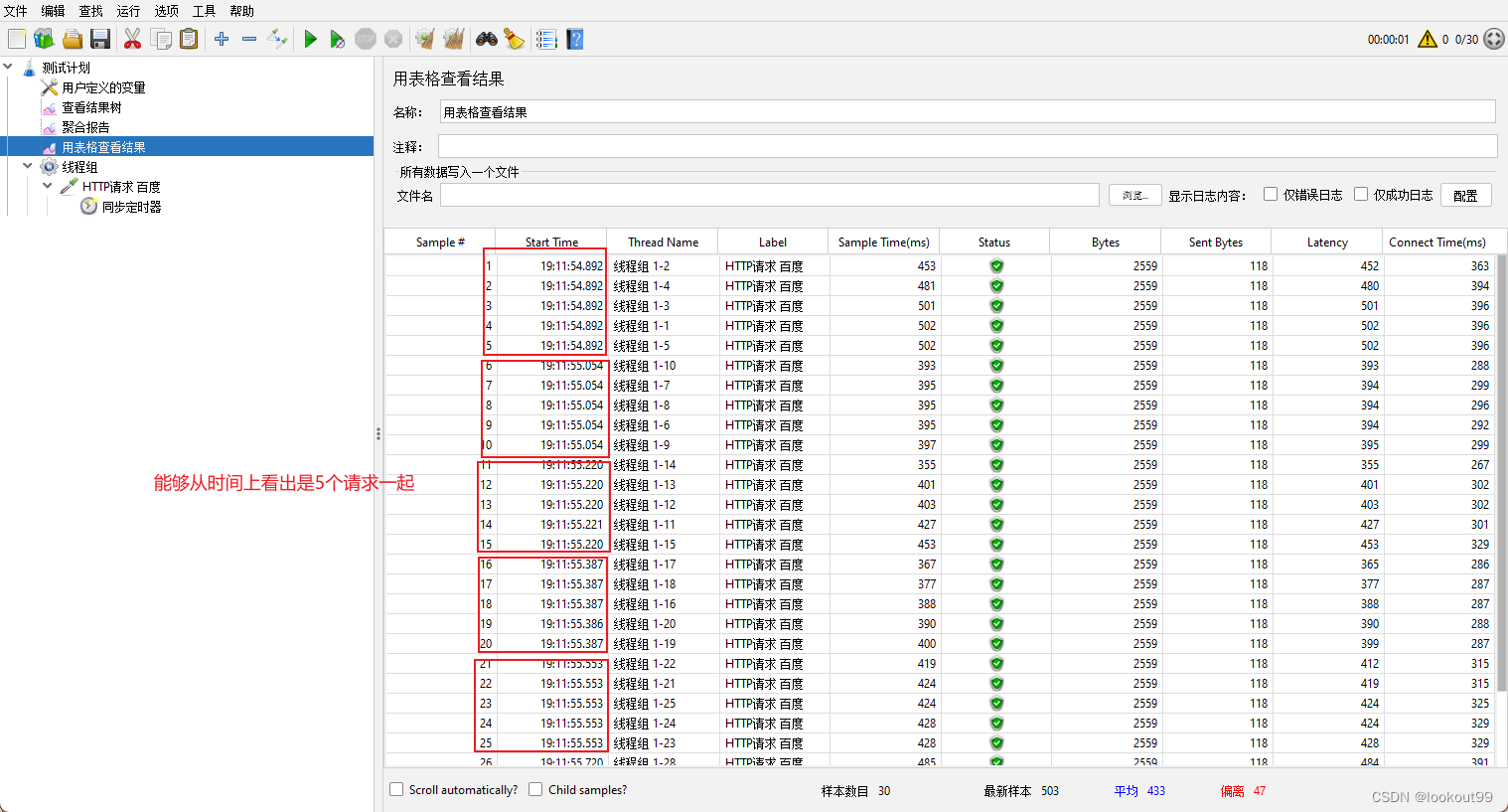 通过察看结果树,我们可以看到每个请求的结果,其中红色的是出错的请求,绿色的为通过Thread Name:线程组名称Sample Start: 启动开始时间Load time:加载时长Latency:等待时长Size in bytes:发送的数据总大小Headers size in bytes:发送数据的其余部分大小Sample Count:发送统计Error Count:交互错误统计Response code:返回码Response message:返回信息Response headers:返回的头部信息