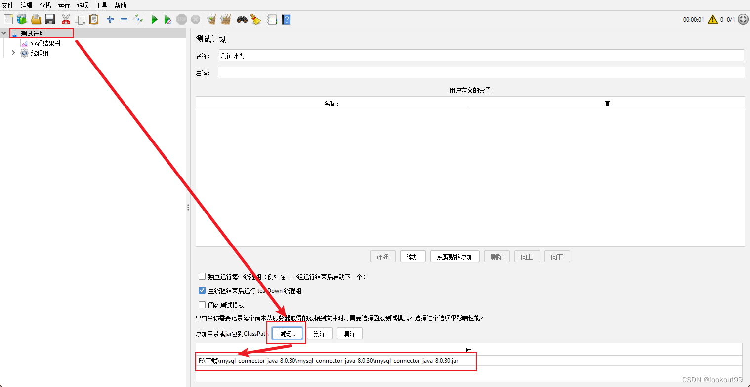方式1:在测试计划面板点击“浏览”按钮,将jdbc驱动添加进来