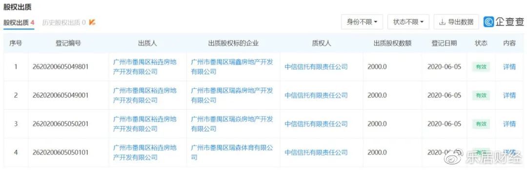乐居财经查阅获悉,恒大足球场的项目公司”广州市番禺区裕垚房地产开发有限公司“(简称“裕垚房地产”),早在两年前以68.13亿拿地之后不久,就将旗下的瑞鑫、瑞淼、瑞焱、瑞森4家子公司的全部股权,都质押给了中信信托。