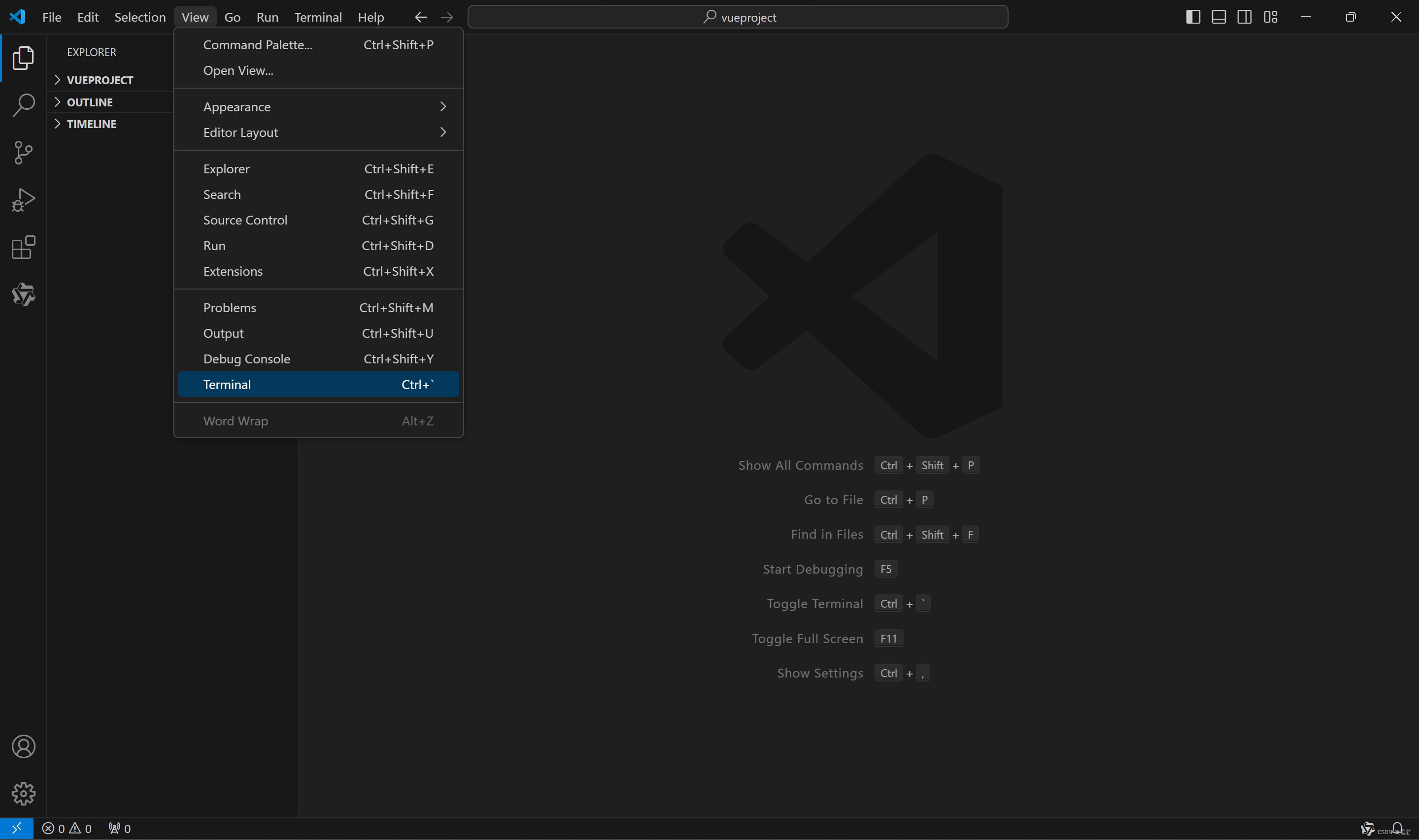 2、打开文件夹后,用View->Terminal打开终端(也可以直接用快捷键“Ctrl + `”直接打开终端)。