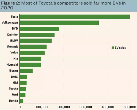 整个2020年,在燃油车时代横扫全球的丰田,只卖出去1.1万辆电动汽车,全球占比不到0.6%。排名最靠前的日系车——Nissan,也仅仅排在第十名。