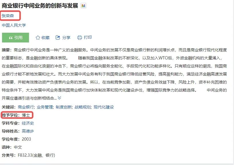然而,在万方中国学位论文全文数据库中,以作者“张荣森”为关键词进行,仅搜索到一篇名为《商业银行中间业务的创新与发展》的相关博士毕业论文。