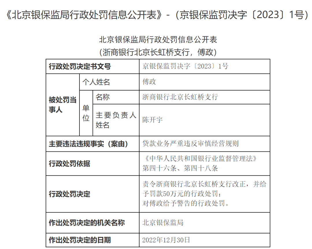 1月9日,北京银保监发布1号罚单,处罚对象为浙商银行(601916.SH、02016.HK)北京长虹桥支行,该行被罚50万元,相关责任人遭到警告。