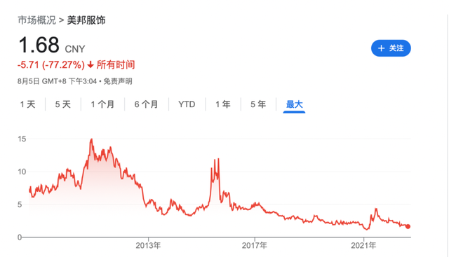 长期业绩低迷,美邦的股市表现也未有起色。截至8月5日,美邦服饰股价1.68元/股,市值42.21亿元,以2010年11月所达到的14.83元/股的股价峰值计算,美邦服饰市值已经缩水88.7%。