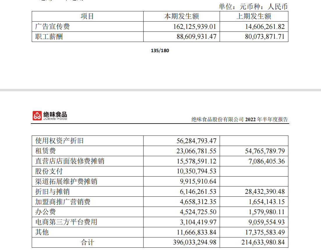 除了盈利能力下滑,绝味食品上半年销售费用还暴涨,2022年第一季度,绝味食品的销售费用为2.36亿,同比增长135%,整个上半年销售费用达到了3.96亿元,同比增长84.52%,营收占比达到了11%。其中,“广告宣传费”1.62亿,同比增长超1000%;公司“渠道拓展维护费摊销”一项,上半年991.6万,而去年同期并无该项费用支出。