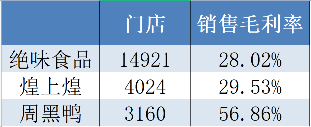 值得一提的是,与煌上煌(002695.SZ)、周黑鸭(01458.HK)等同行卤味企业相比,绝味食品在门店规模远大于两家企业的情况下,销售毛利率却垫底。截至2022年上半年,煌上煌门店4024家,仅占绝味食品门店规模的26.97%,销售毛利率29.53%;周黑鸭门店3160家,仅占绝味食品门店规模的21.19%,销售毛利率56.86%。