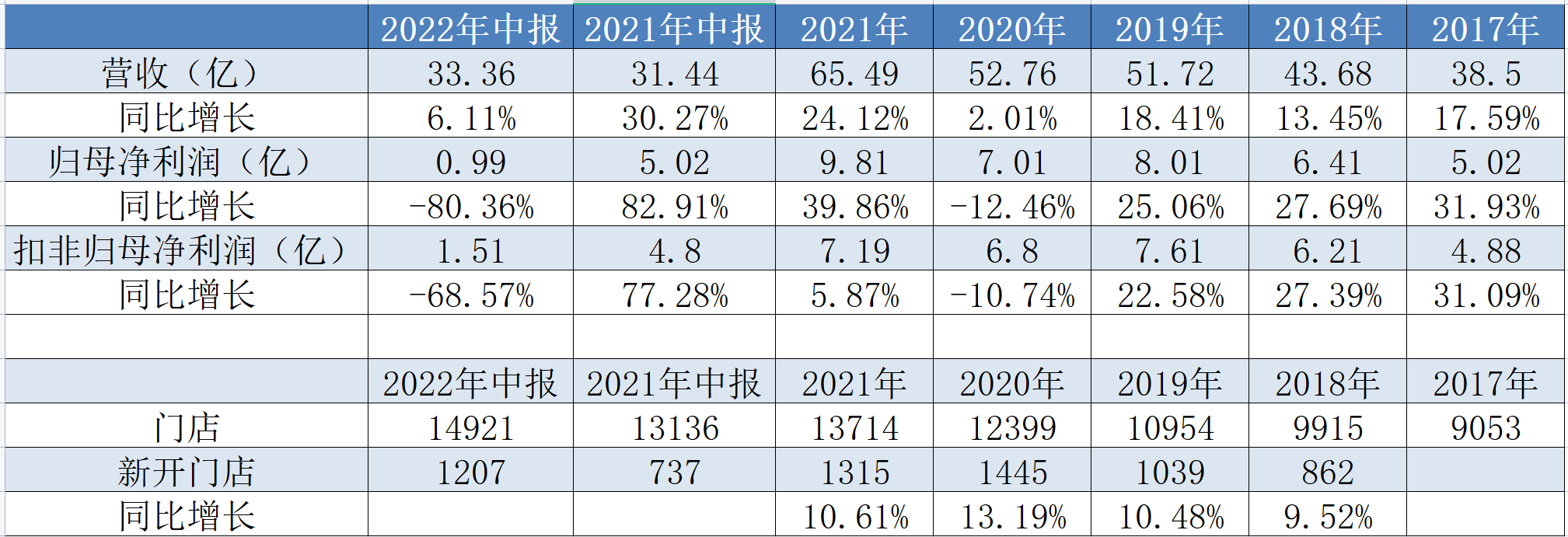 不过,从2022年中报来看,扩张更加激进的同时,却并未带来亮眼的业绩,2022年上半年新开门店1207家,比去年同期的737家多了470家,相当于2021年一整年的新开门店数;营收“原地踏步”的同时,盈利能力大幅下降,其中,营收33.36亿,同比增长6.11%,扣非归母净利润1.51亿,同比减少68.57%。