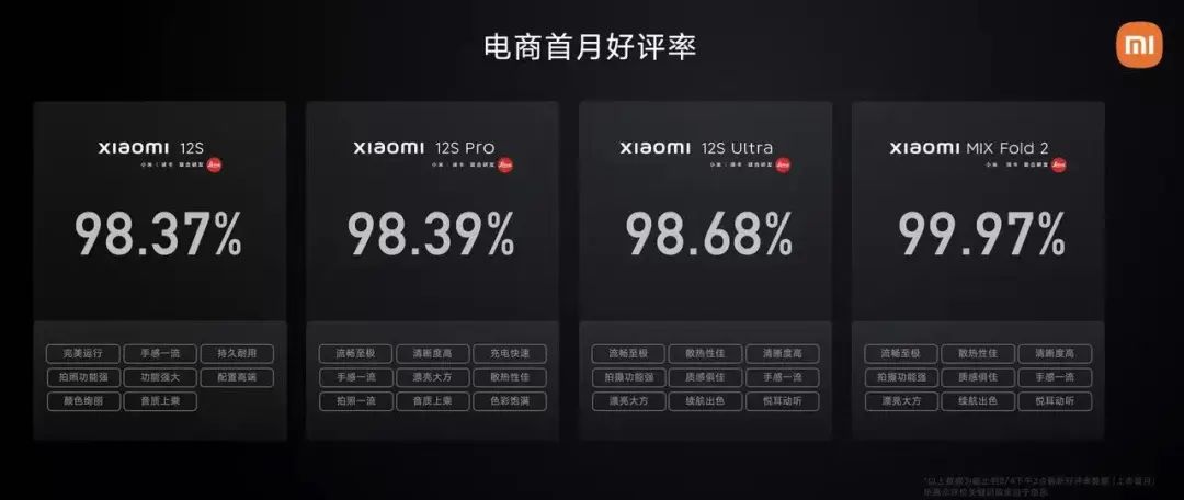 今年下半年,小米一口气发布了小米12S、小米12S Pro、小米12S UItra、小米 MIX Fold2等多款高端线产品,在用户换机需求越发低迷的当下,98%以上的好评率尤其罕见,小米高端系列的口碑正在全面回升。
