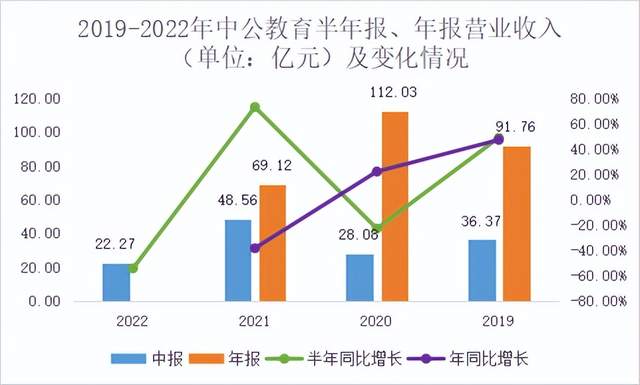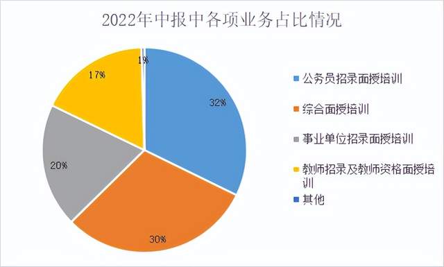其中,长期占营业收入一半的“公务员招录培训面授业务”在2021年急转直下,相比去年同期少了30亿元收入,这也是导致其2021年总收入大幅下滑的主要原因。而2022年中报显示,公务员招录面授培训的占比仅为32%,营收仅7.18亿元,相对去年同期下滑了68.98%,情况不容乐观。