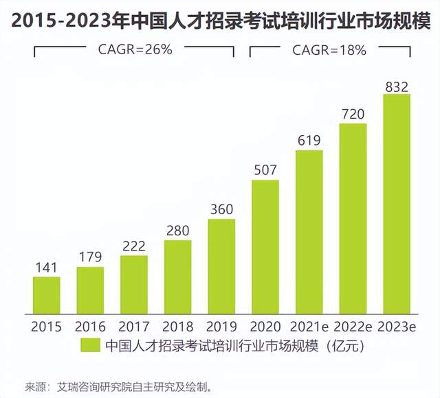 公务员热让公考、编考培训行业市场规模的快速增长。艾瑞咨询研究院的数据显示,近年来竞争越来越激烈,尤其是在疫情开始的2020年,参培率达到了31.7%。根据预测,到2023年人才招录市场规模有望达到832亿元,整体发展较为迅速。