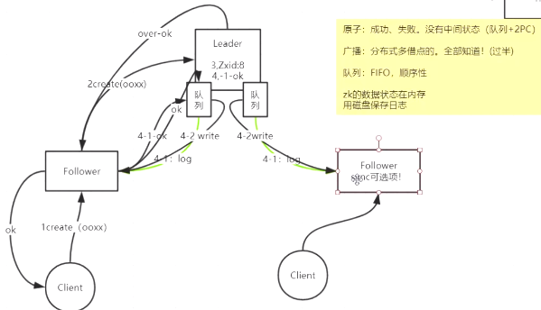 每个follower和leader连接都会各自有一个发送信息的队列,client提出create请求,follower将请求提交给leader,leader发起让每个follower将创建这个事情,写入日志,follower回送一个ok的消息,leader也是一个ok,一个leader和一个follower 是2个 ,已经过半,则leader向每个follower发送write 信息更改内存数据信息,follower会返回一个ok,最终一致。最后leader 返回给follower,再返回给client-ok。