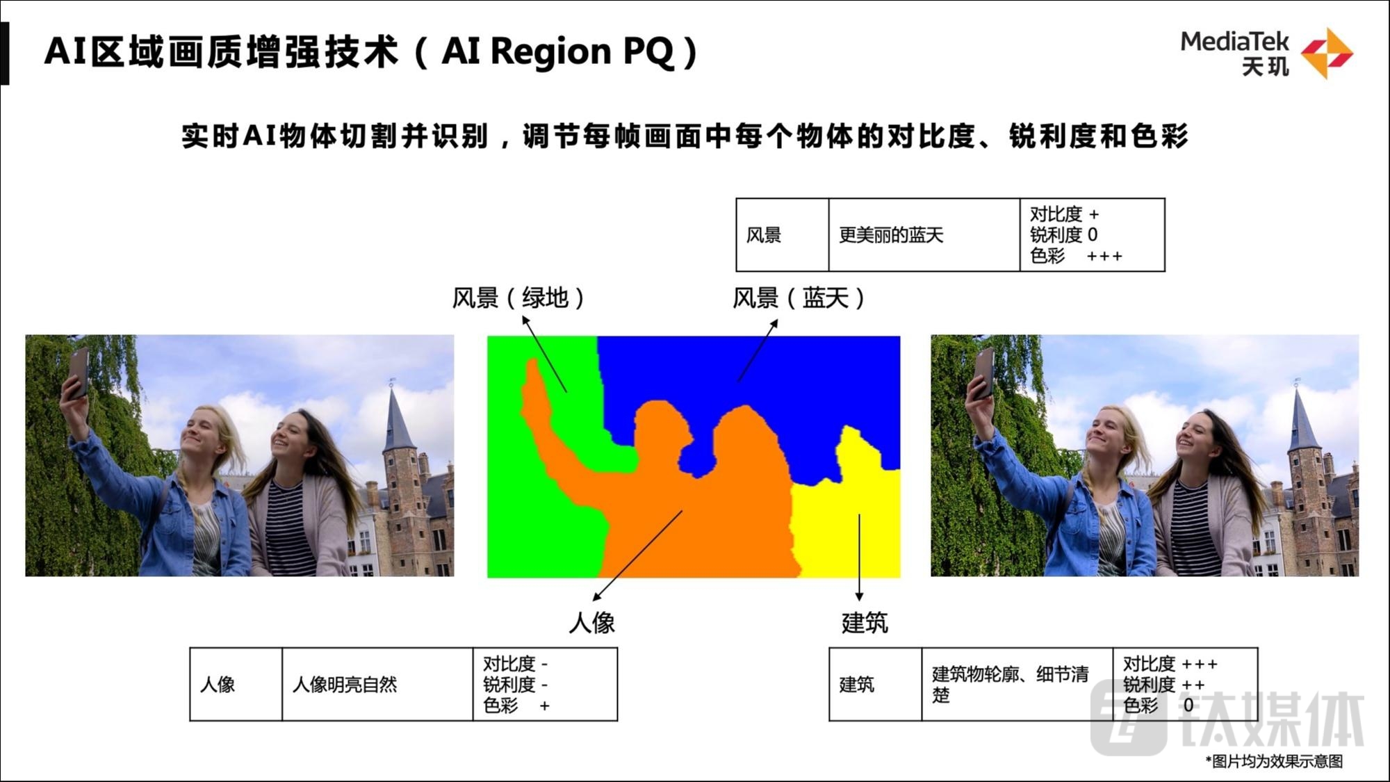 此外,在视频的整体观感上,也能通过联发科的AI技术进行优化,比如通过AI场景画质增强技术可实时识别图像中的场景内容,以优化建筑、风景、人像等场景下每帧画面的对比度、锐利度和色彩。另一方面,AI区域画质增强技术还可实时进行物体识别和切割,调节每帧画面中不同物体的图像参数。