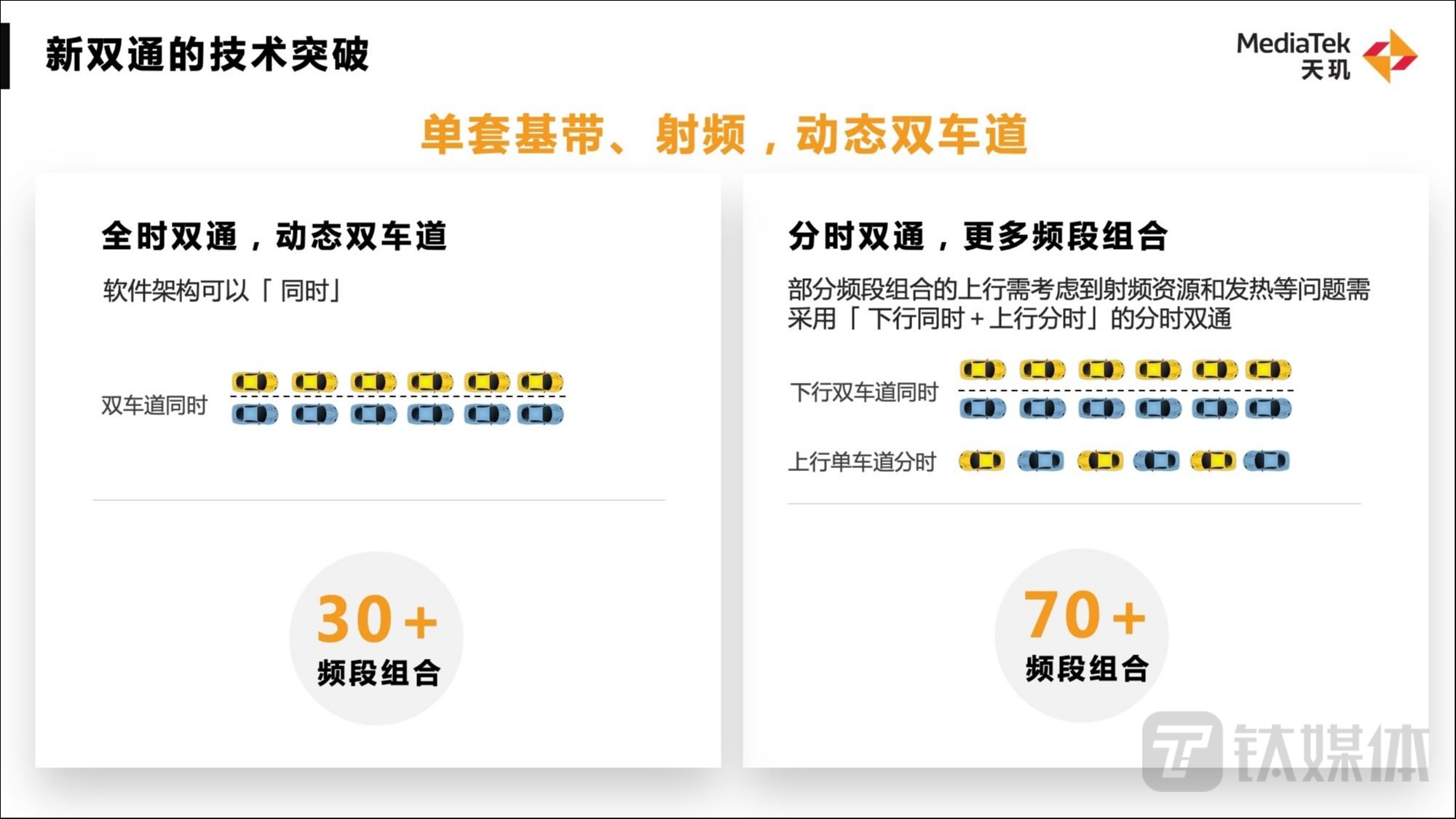 而联发科则已经实现了使用单套基带、射频以及“动态双车道”软件架构实现5G新双通,其中,全时双通可实现动态双车道数据传输,支持30种以上的频段组合,分时双通则可实现“下行同时+上行分时”数据传输,可支持70种以上的频段组合。