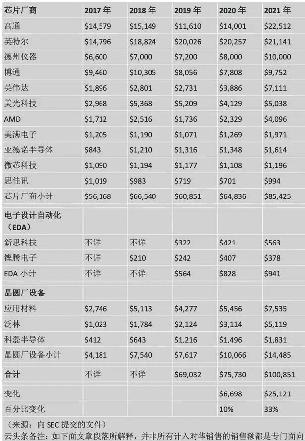 高通和英伟达这两家2021年在中国的销售额合计增加了近120亿美元,达到约296亿美元。美国三大晶圆厂设备制造商:应用材料、泛林和科磊在中国的收入2021年增加了44亿美元,增幅达到44%。