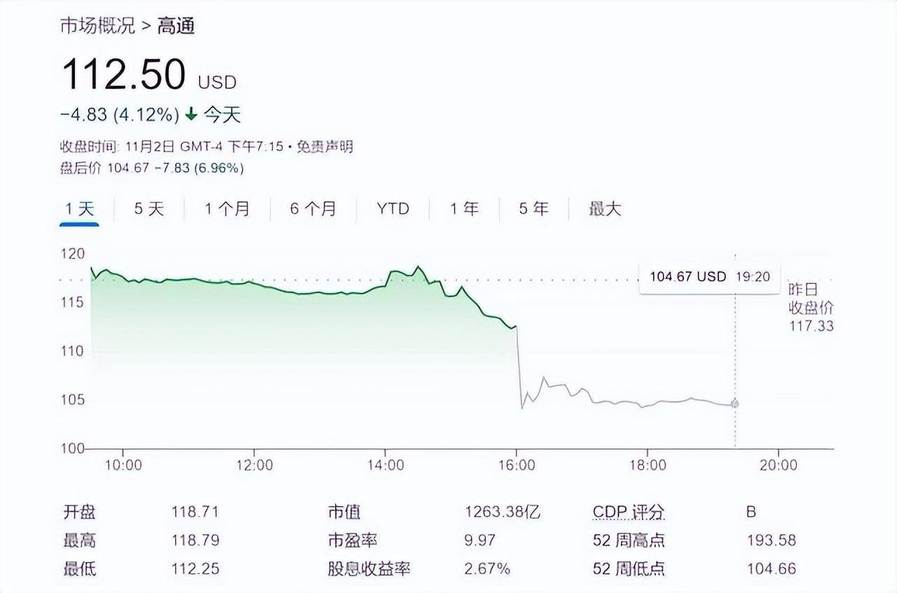 当地时间11月2日,高通在最新的财报释放了悲观预期,2023财年第一财季收入约为92-100亿美元,大幅低于分析师预期的120.3亿美元。高通也与苹果采取了一致的招聘冻结等措施削减开支费用。这直接引发市场担忧,高通于11月3日再度大跌超7.66%,年内跌幅扩大至42.3%,总市值缩水至1164.5亿美元(约合人民币8475亿元)。