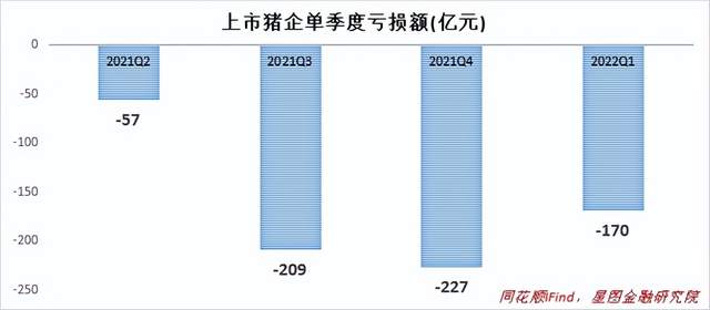 而2022年4月的去化低点4177万头,仍略高于国家调控区间的上限。这说明未来生猪供给充足,猪肉价格上涨空间有限,生猪养殖企业很难获得足够的利润弥补近一年的巨额亏损,现金流压力难以得到有效改善。过去四个季度(2021Q2-2022Q1),仅上市生猪养殖企业便累计亏损664亿元,不出意外,2022Q2依旧亏损。