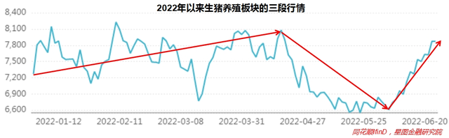 复盘今年生猪养殖板块行情走势,大致可分为三段:第一段1月1日-4月19日,震荡上行,累计上涨11.15%;第二段4月20日-6月6日,快速下跌,累计跌幅18.2%;第三阶段6月7日-24日,快速上涨,累计涨幅18.6%。
