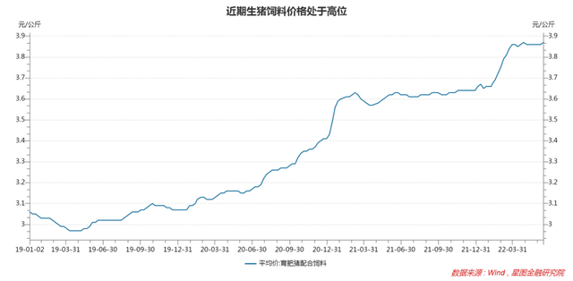 同时,随着全球农产品价格持续走高,近年来的生猪养殖成本也在持续攀升。近期,受俄乌冲突等因素影响,玉米、豆粕等农产品价格再次出现快速攀升,带动国内生猪饲料价格再上一个平台。以生猪养殖料肉比(生猪每增重1公斤消耗的饲料重量)2.6倍计算,与2019年相比,当前每公斤生猪仅饲料成本便提升约2.2元。