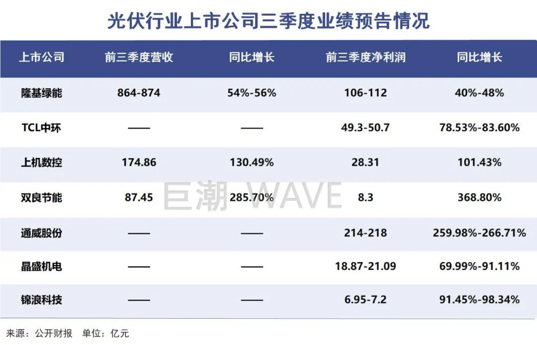 从设备到硅料、硅片和一体化企业,上至千亿龙头,下至跨界新贵,普遍收获了可观的业绩增长。如晶盛机电、高测股份、通威股份、隆基绿能、TCL中环、双良节能、上机数控、锦浪科技等玩家纷纷披露了不错的三季报预告。