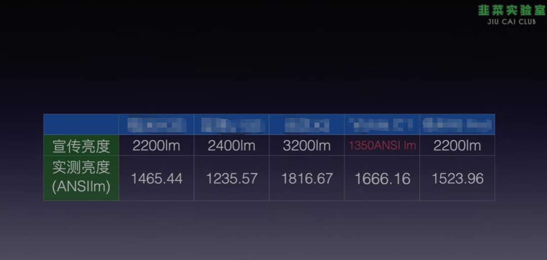 在网上可以搜到很多与“投影仪亮度虚标”相关的测试内容,市面上绝大多数产品在实际使用场景下,都无法达到官方宣称的高亮度。B站Up主“韭菜实验室”就对市面上五款热门的投影仪产品进行实测,在相同的测试环境和标准下,居然有四款产品亮度远低于官方宣传的数值,仅一款达标。而唯一达标的这款,实际亮度也仅为1666ANSI流明。