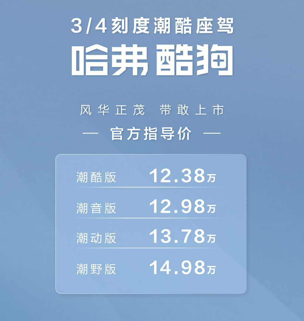 8月10日晚间,哈弗酷狗在苏州正式上市,共推出4款车型,售价区间为12.38-14.98万元。该车是哈弗旗下全新紧凑型SUV,定位在大狗之下,主打复古越野路线。同时,酷狗还配备了潮酷的“4D音乐座舱”,搭载来自JVC的18个立体环绕声扬声器,拥有车载920W的独立数字功效。