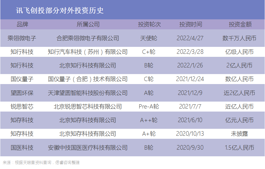 除了直接投资,科大讯飞还有两家专业做投资的机构——讯飞创投、讯飞云创。2010年,讯飞创投平台成立,定位是“专注于智能科技及其应用创新领域投资的赋能型产业投资平台”。