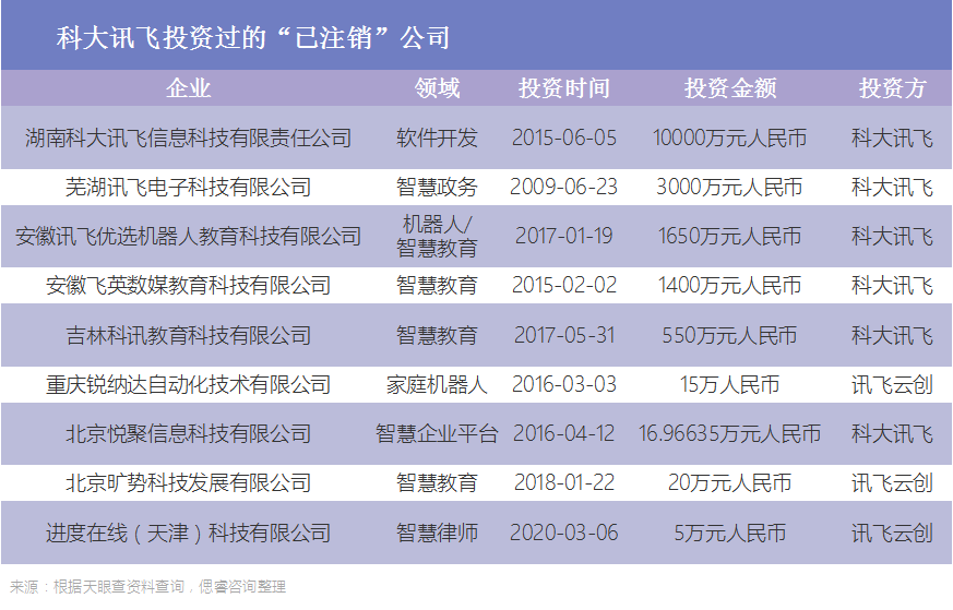 根据天眼查数据,包括以上几家公司在内,共有12家科大讯飞曾投资的公司状态显示为“注销”。