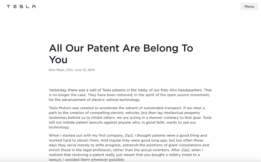 之后一周内,特斯拉股价飙升40%,市值一度高达100亿美元,甚至超过了老牌汽车公司菲亚特和三菱。把时钟往后拨到2014年,那一年,马斯克在特斯拉官网发布了那篇著名的《All Our Patent Are Belong To You》,他说**“昨天,在我们总部的大堂里有一面专利墙,但如今情况变了,为了推进电动车技术的发展,我们推倒了这堵墙。”**