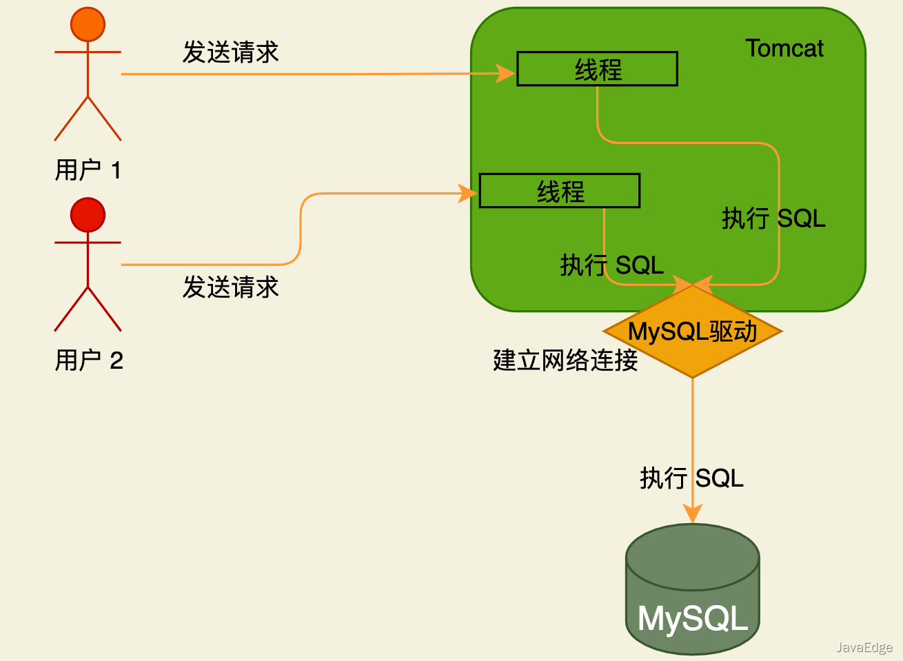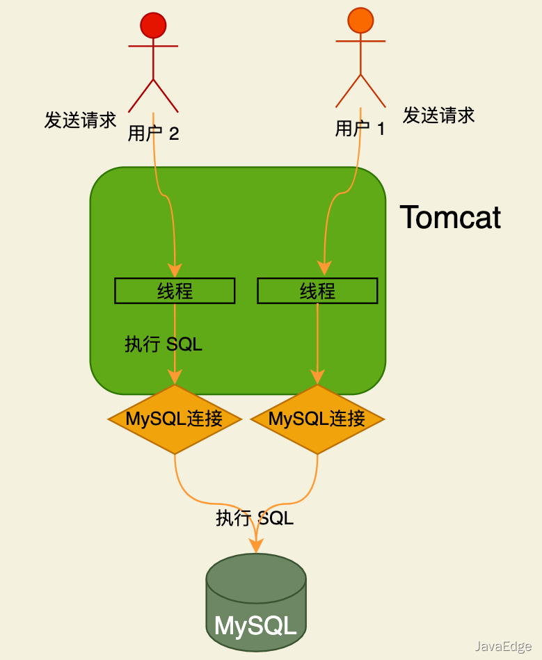 若Tomcat中的多个线程并发处理多个请求时,都去抢夺一个连接访问MySQL,那效率肯定很低: