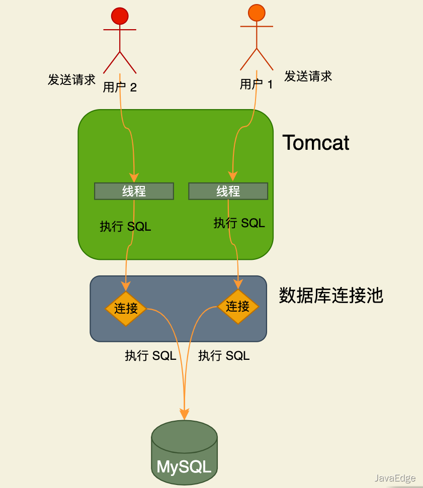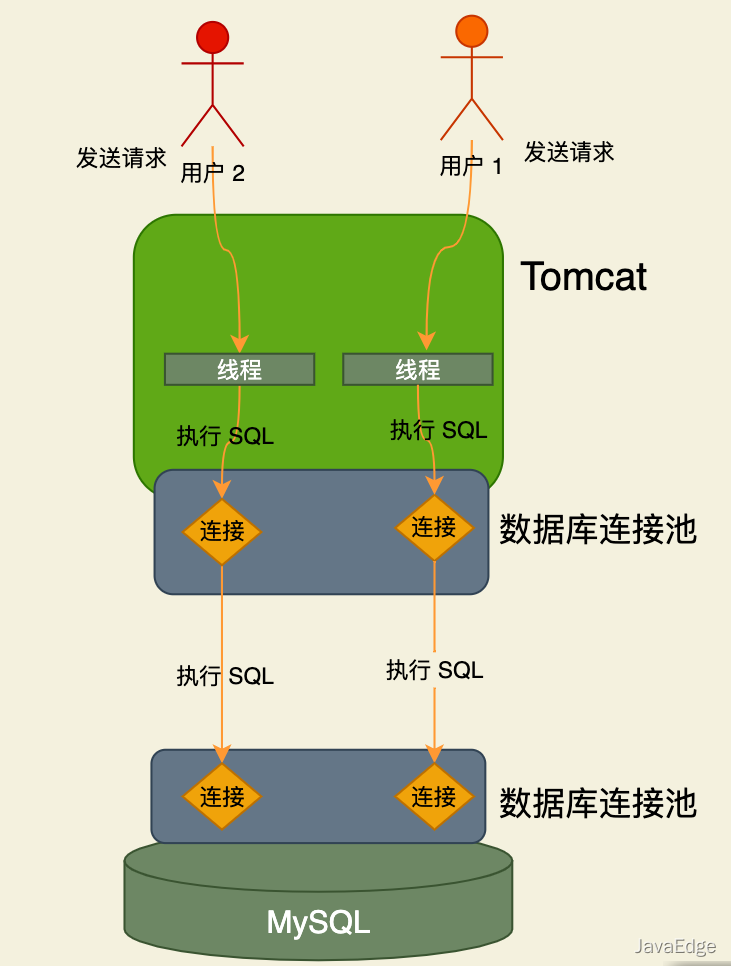 所以得使用一个数据库连接池:在一个池子里维护多个数据库连接,让多个线程使用池中不同数据库连接去执行SQL,执行完SQL后,不是销毁数据库连接,而是将连接放回池,后续复用。