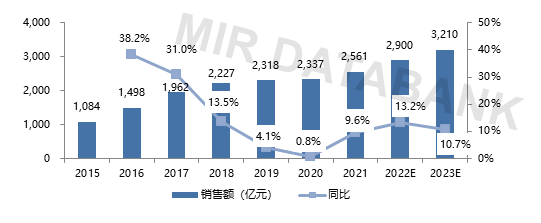 尽管在之后的2019-2020 年,受上游原材料价格制约,叠加疫情影响,产业增幅逐渐降低,但国内的锂电池销量也稳定地保持在2000亿之上。2020 年底上游原材料价格走弱,疫情好转复工复产加快,行业有所回暖(尤其是下游新能源汽车领域在中国市场渗透率不断提高),国内各电池厂又提出大规模扩产计划。MIR 睿工业综合预计,2023年国内锂电池总销量将突破3000亿大关。