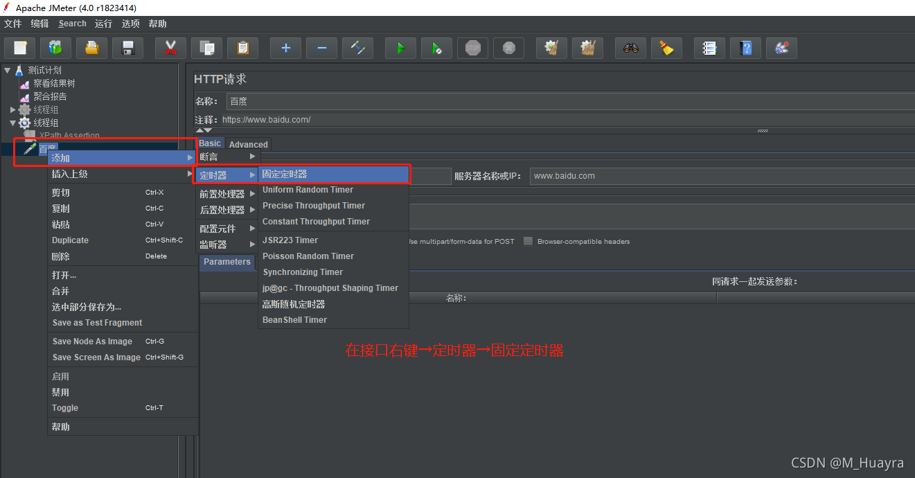 ⑥、定时器:负责定义请求(线程)之间的延迟间隔,模拟对服务器的连续请求。