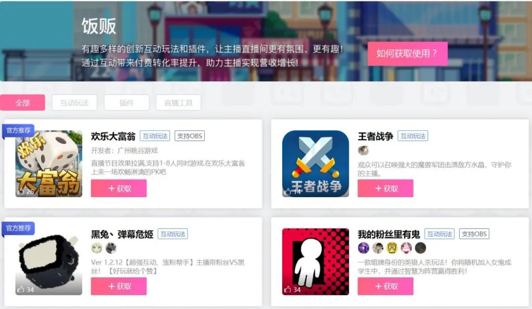 今年,「哔哩哔哩创意工坊」上线了创作者服务中心和饭贩两个测试版板块。饭贩鼓励更多开发者上传玩法,Up主在饭贩板块中,可以直接找到一些直播插件以及直播互动游戏。