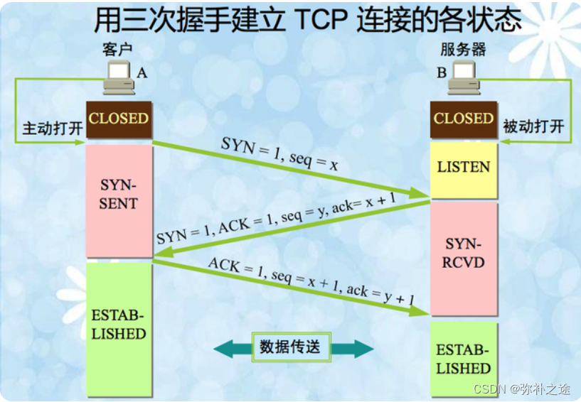 **握手之前:**B的TCP服务器进程先创建传输控制块TCB,准备接受客户进程的连接请求,服务器进程就处于LISTEN(收听)状态。A的客户端进程也是首先创建传输控制块TCB。 **第一次握手:**A向B发出连接请求报文段,这时首部中的同步位SYN=1,同时选择一个初始序号seq=x。TCP规定,SYN报文段(即SYN=1的报文段)不能携带数据,但要消耗掉一个序号。这时,TCP客户进程进入SYN-SENT(同步已发送)状态。 **第二次握手:**B收到连接请求报文段后,如果同意建立连接,则向A发送确认。在报文段中应把SYN位和ACK位都置为1,确认号是ack=x+1,同时也为自己选择一个初始序号seq=y。这个报文段也不能携带数据,但同样要消耗掉一个序号。这时TCP服务器进程进入SYN-RCVD(同步收到)状态。 **第三次握手:**TCP客户进程收到B的确认后,还要向B给出确认。确认报文段的ACK置1,确认号ack=y+1,而自己的序号seq=x+1。TCP标准规定,ACK报文段可以携带数据。但如果不携带数据则不消耗序号,在这种情况下,下一个数据报文段的序号仍是seq=x+1。这时,TCP连接已经建立,A进入ESTABLISHED(已建立连接)状态。当B收到A的确认后,也进入ESTABLISHED(已建立连接)状态。