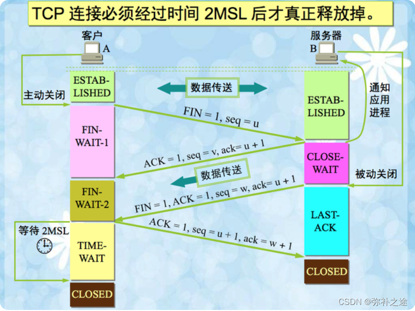**挥手后:**请注意,现在TCP连接环没有释放掉。必须经过时间等待计时器(TIME WAIT timer)设置的时间2MSI后,A才进入到CLOSED状态。时间MSL叫做最长报文段寿命(Maximum Segment Lifetime), RFC 793建议设为2分钟。但这完全是从工程上来考虑的,对于现在的网络,MSL = 2分钟可能太长了一些。因此TCP允许不同的实现可根据具体情况使用更小的MSL值。因此,从A进入到TIME-WAIT状态后,要经过4分钟才能进入到CLOSED状态,才能开始建立下一个新的连接。当A撤销相应的传输控制块TCB后,就结束了这次的TCP连接。