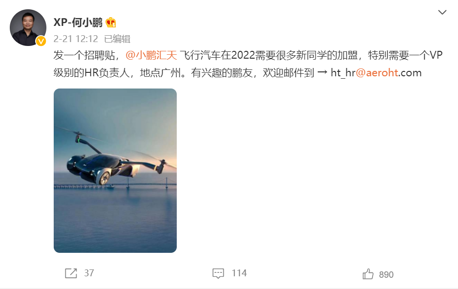 一天之前,小鹏汽车创始人、董事长何小鹏在自己的微博上发布了一则招聘启事,为小鹏的飞行汽车项目小鹏汇天招揽人才。“特别是需要一个VP级别的HR负责人”,何小鹏写道。