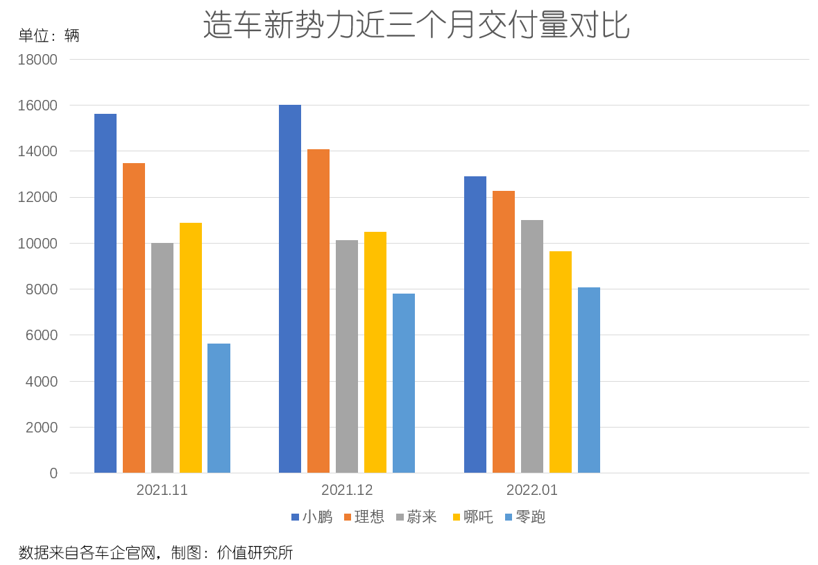 数据显示,哪吒汽车、零跑汽车和威马汽车分别是2021年上险量排名4-6位的造车新势力,分别为64773辆、43960辆和35647辆,同比分别增长353.28%、480.71%和103.86%,除了威马之外同比增速全都赶超“蔚小理”。尤其从去年下半年以来的增长曲线看,哪吒、零跑距离饱受供应链之困的蔚来已经非常接近,前者在11和12月交付量还一度超越蔚来。