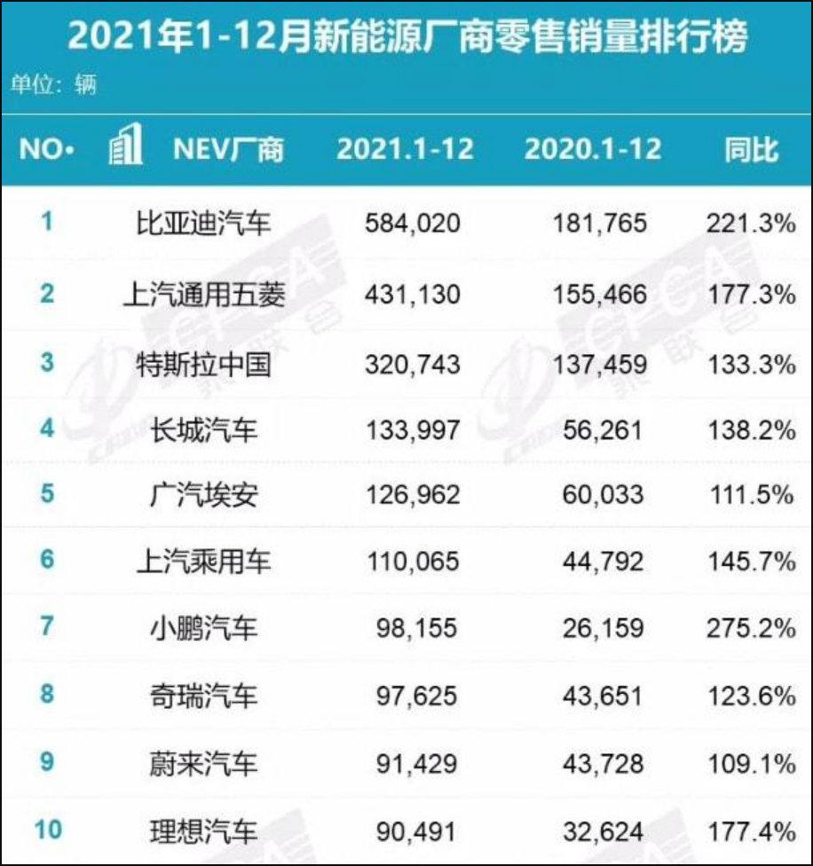 在乘联会公布的自主品牌新能源车零售排行榜中,小鹏、蔚来、理想纷纷挤进前十,位居7、9、10位。虽然产能规模和比亚迪、上汽通用五菱等传统车企还有很大差距,但已经达到自己的历史最佳水平。数据显示,小鹏、理想和蔚来2021年新车销量分布同比上涨275.2%、177.4%和109.1%,全都实现翻倍。