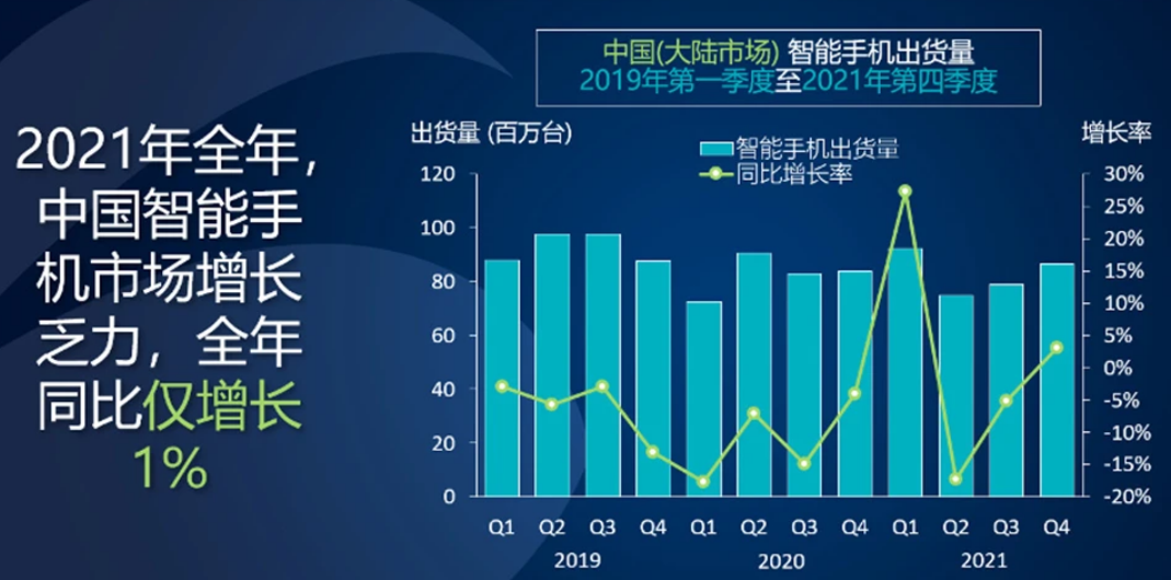 Canalys最新报告显示,2021年四季度中国智能手机市场出货量8660万部,同比仅微增3%,全年出货量3.33亿台,同比增长1%。四季度的同比增速,已经是近三年的最佳表现,但整体市场体量还是较2019年疫情爆发前萎缩近10%,且增速依旧疲软。