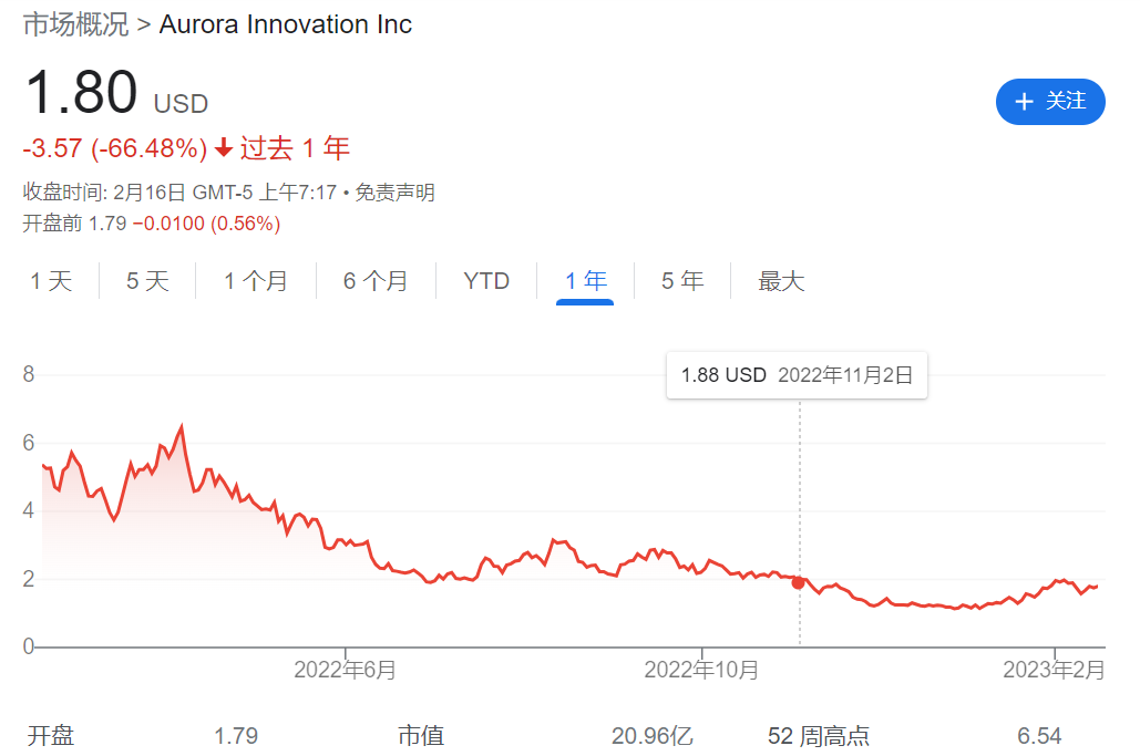 二是因为二级市场上市难度升级,且表现不佳。被称为“Robotaxi第一股”的Aurora于2021年11月初上市,上市当天股价最高11.7美元,市值超135亿美元。不过很快,Aurora股价从最高点一路下跌,截止美东时间2023年2月15日下午4时,收盘价为1.8美元/股,总市值仅剩下21亿美元。
