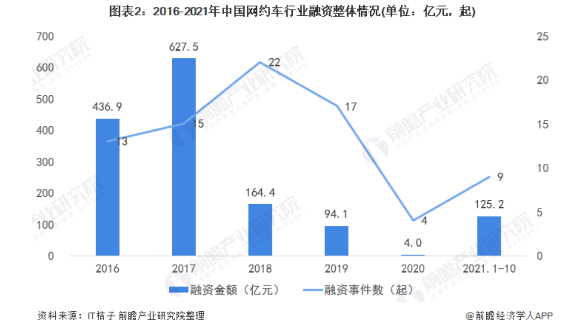 在国内市场,一级融资市场热度不减。IT桔子统计的数据显示,2021年国内网约车行业共完成9起投融资事件,涉及金额合计125.2亿元,是过去三年的最高水平。其中,曹操出行、T3出行、大众出行等头部平台都在去年先后完成最新一轮融资,T3出行的77亿元A轮融资更是近年来网约车行业最大单一融资。