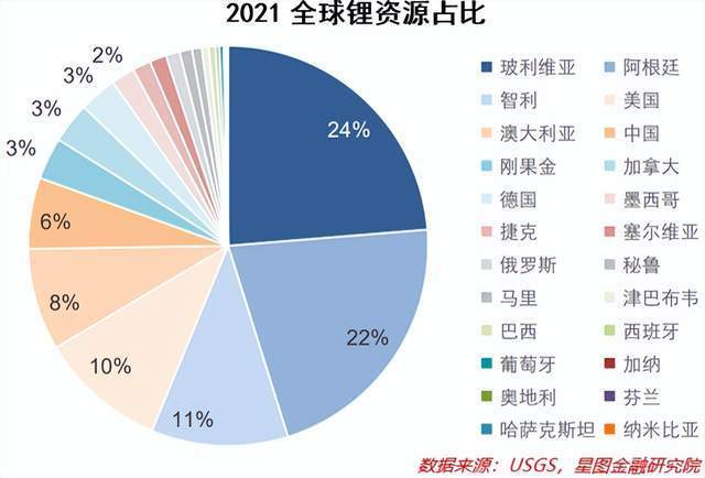 相比之下,2021年全球锂产量仅为10万吨。但储量并不等于产量,受制于各国基础设施、自然环境、开采技术等各方面因素影响,目前锂矿主要产自于澳大利亚。