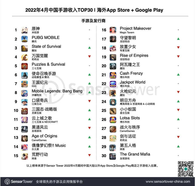 - 米哈游的现象级手游《原神》蝉联4月出海手游收入榜第一名,腾讯的《PUBG Mobile》、莉莉丝的《万国觉醒》是榜单常客;