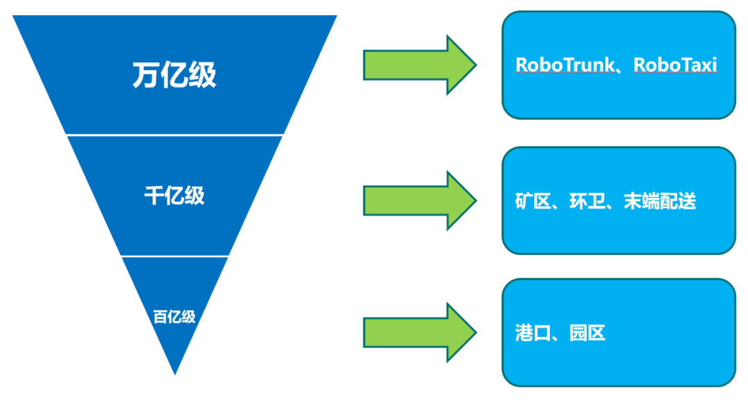 特定场景无人驾驶按照市场容量,从大到小排序,可以分为万亿级的RoboTrunk、RoboTaxi;千亿级的矿区、环卫、末端配送;百亿级的港口、园区。