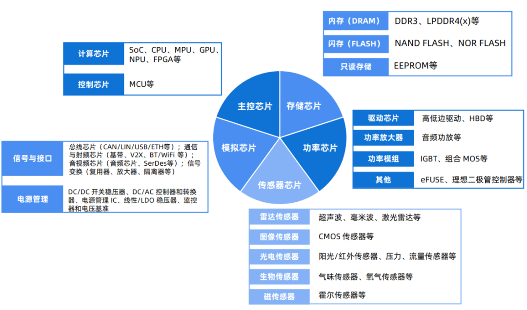 汽车芯片大致可以分为主控芯片、功率芯片、 存储芯片、通信芯片以及传感芯片五大类。国产替代背景下,供应链自主可控进一步加速了国内汽车半导体市场的蓬勃发展。